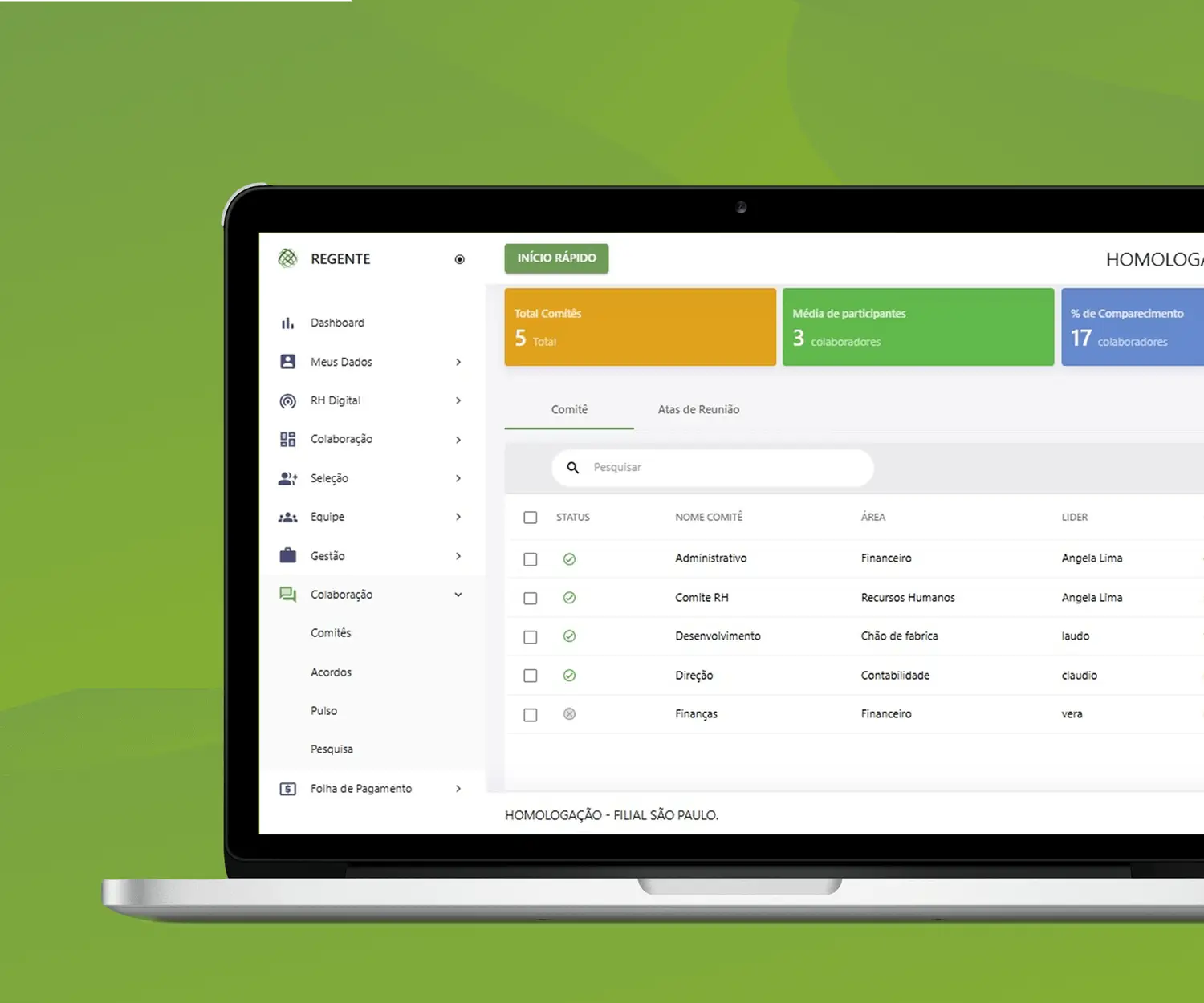 Com a Regente, você centraliza o que mais impacta a rotina do seu time: processos de RH, folha de pagamento, comunicação com colaboradores e gestão colaborativa.